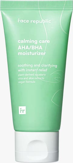 - The Face Republic Calming Care AHA/BHA Moisturizer combines 20,000ppm Plant-Derived Squalane, Aloe Barbadensis Leaf Extract, Centella Asiatica Extract, Lactic Acid, and Willow Bark Extract for soothing, clarifying, and hydrating care. Squalane moisturizes and strengthens the skin barrier, while gentle AHA and BHA refine texture. Aloe and cica soothe irritation, niacinamide brightens, and adenosine supports firmness and elasticity.
