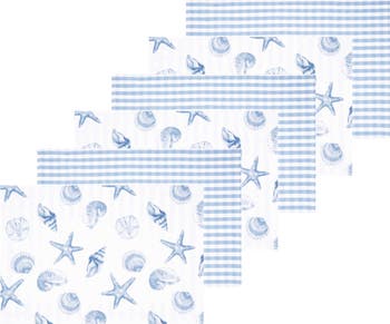 For a coastal inspired tablescape, the Calming Seas printed table linen collection captures the essence of the ocean’s natural wonders. A variety of seashell and sea star shapes are randomly scattered on a crisp white background. Rendered in a watercolor style effect, these table linens reverse to a classic gingham plaid in a coordinating shade of soft blue.