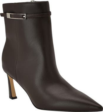 A logo-accented buckle highlights the sleek faux-leather upper of a pointy-toe bootie lifted by a svelte heel and fastened with a full-length side zipper.