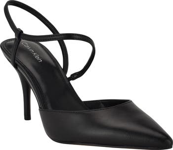 Lightly padded cushioning on the footbed perfects the chic and sleek pump that's completed by a pointed toe and a buckle-less ankle strap design.