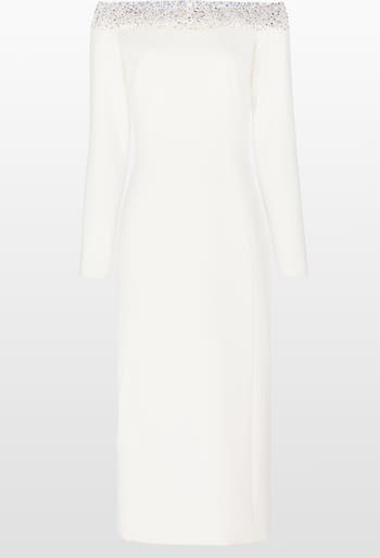 Exude refined elegance in this stunning off-shoulder dress, designed to captivate with its timeless sophistication. The gracefully draped off-shoulder neckline is beautifully embellished, adding a touch of sparkle and opulence. The fitted silhouette accentuates the curves, flowing seamlessly into a sleek mid-length skirt that adds a contemporary yet classic flair. Perfect for cocktail parties or evening soires.