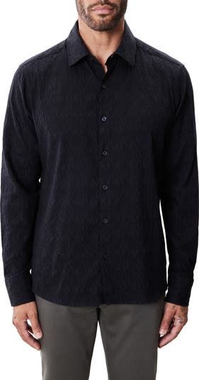 A puckered finish keeps the look both elevated and relaxed in an inky-black shirt made of cotton and nylon with a touch of enhanced stretch for easy-moving comfort. Pair it with softer fabrics and leave it untucked for a late-into-the-night vibe that starts the moment you get dressed.