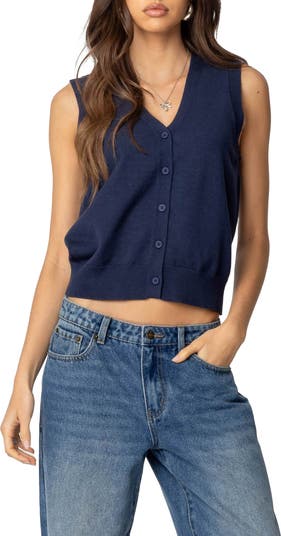 Make a retro-cool style statement in this lightweight knit vest that buttons down the front.