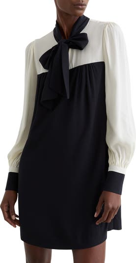 Ties at the neckline and cuffs further the '60s-inspired vibes of this colorblocked shift dress finished with a button-closed inverted back pleat for pretty movement and a couture look.