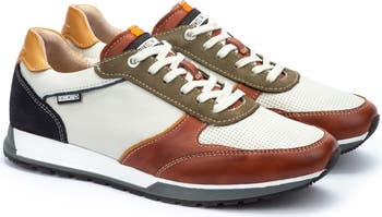 Mixed colors and textures lend visual intrigue to a sporty leather sneaker crafted for comfort.