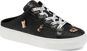 Polished logo accents gleam from this sporty mule framed by decorative lace-up ties and boosted by a white platform sole.