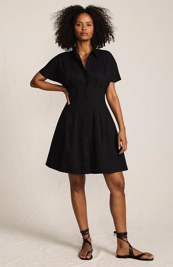 This cotton cambric dress is easy, breezy, and polished. The lightweight fabric moves beautifully. Soft pleats in front and back flatter your shape. Dolman sleeves and a turn-back placket keep things relaxed yet refined. Fully lined and finished with pockets for all-day ease.