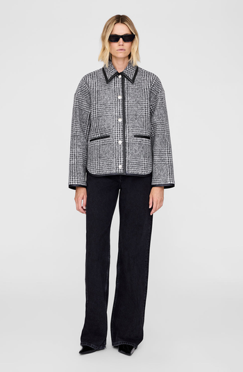 A workwear-inspired jacket made from a wool blend featuring a black and grey check fleece pattern.