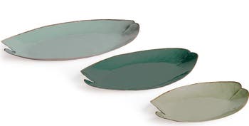 This charming set of hand-painted decorative trays are inspired by lily pads. With a gold edge detail, and coordinating verdant hues, they add a pop of colorful character to kitchen island, side table or ottoman.