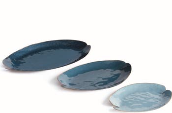 This charming set of hand-painted decorative trays are inspired by lily pads. With a gold edge detail, and coordinating soft blue hues, they add a pop of character to kitchen island, side table or ottoman.