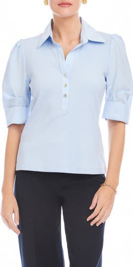 Puffed woven sleeves contrast against the ribbed henley body of this mixed-media top that's a perfect choice any day of the week.