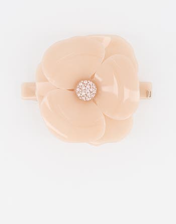 A symbol of sensuality and lightness all at once, Camellia is an iconic pattern of Maison Alexandre de Paris: while it is steadily reinvented throughout our seasonal collections, our Timeless collection features it in classic shades for those who are fond of its beautiful sobriety. The soft glow of its petals has appeared through a careful polishing that brought out the natural shine of acetate. Our craftsladies have embedded its heart with matching Swarovski crystals, by hand and with love. The Camélia A. hair barrette is perfect for a ponytail with thin hair or a half-up style with thicker hair.