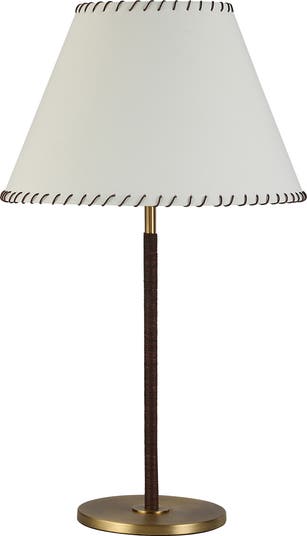This dimmable, Western-inspired table lamp showcases an antiqued-brass finish and faux-leather stitching to add a handmade look to your décor.