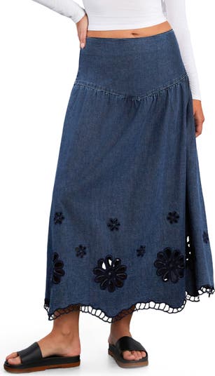 This maxi skirt is made of structured stretch denim detailed with floral eyelets along the scalloped hem for an Americana-boho look that embraces the ease of warm, sunny days.
