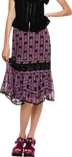 Guaranteed to evoke glamour and style, our Cameo Stripe Print Midi Skirt is a delightful piece for all-day wear. The A-line silhouette falls into a flaring ruffle past the knees, showcasing the lovely drape of the soft chiffon. Adorned by black lace trim, this skirt embodies Anna Sui's feminine, grunge charm. An invisible zipper at the side seam completes this delicately graceful piece.