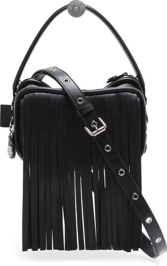 A structured silhouette detailed with a curtain of fringe, gleaming hardware and a logo-engraved key charm revs up the moto appeal of this dopp kit-inspired leather handbag that appeared on the label's spring '26 runway. A removable crossbody strap offers an additional carrying option.