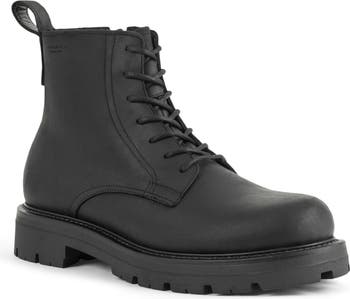 A side zipper and lace-up design offer easy entry on a supple leather boot grounded by a durable lug sole.