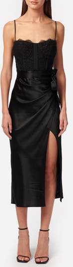 Eyelash fringe dusts the sweetheart neckline of this sleeveless slipdress complete with a fitted, boned bodice and sultry side slit.