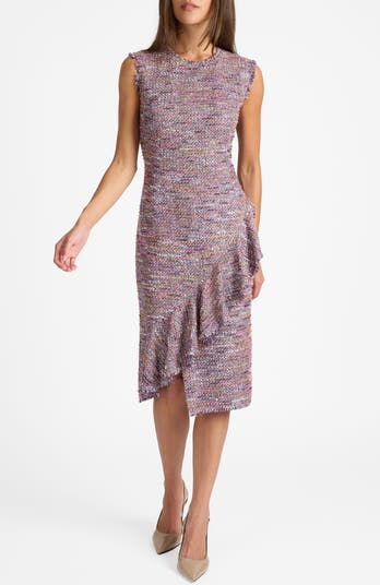 - Sleeveless Sheath Dress with Skirt Ruffle in Luxury Tweed with Subtle Sequins
