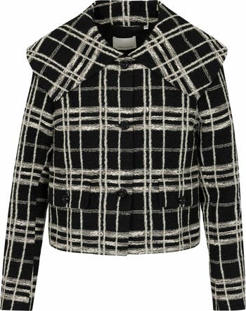 This striking jacket showcases a bold plaid pattern in black and white, featuring an eye-catching exaggerated collar. Crafted with Italian fabric and meticulously produced in Poland, it's finished with sophisticated faux horn buttons.