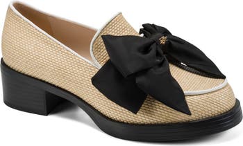 A timeless loafer is emboldened in signature KLP fashion with a woven upper, chunky stacked heel and oversized bow.