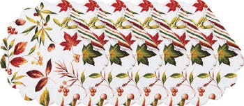 The Camilla tabletop collection creates a warm, inviting fall dining table with its vibrant jewel tones of red, green, and amber. A fall foliage motif of maple leaves and acorns fall against a white ground. Reverse to a painterly striped pattern to build a cozy mood no matter the season.