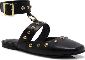 Glossy studs and geometric hardware add a bold aesthetic to a square-toe mule featuring a padded footbed and adjustable ankle strap for comfortable and secure wear.