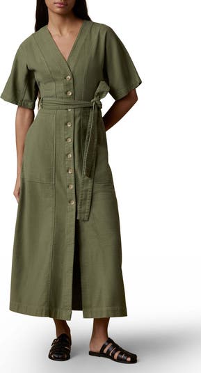 A removable tie belt tethers the waist of this button-front midi dress cut from organic stretch cotton in relaxed A-line silhouette.