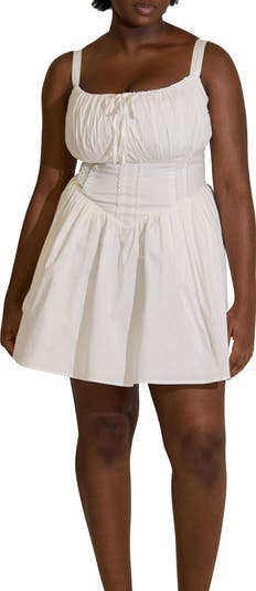 Designed for fuller-bust proportions, this cotton mini dress features a structured, bra-free bodice with internal boning and adjustable straps for a secure fit. Fitted through the bust and waist, the silhouette falls into a softly flared skirt with lace bodice detailing and functional side pockets.