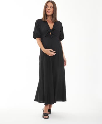 Keep it simple yet sophisticated with the Camille Tie Front Dress. The V-neckline features an adjustable bust tie allowing this dress to grow with you during pregnancy and beyond, allowing for easy nursing access. Made from a light linen blend, this feminine silhouette has a midi length A-line skirt and gathered elbow length sleeves. Wear yours from AM to PM with your favourite heels or casual sneakers.