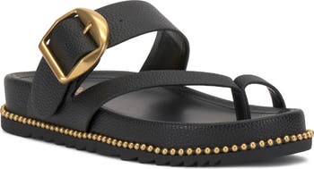 Polished studs and buckle hardware add an extra flash of contemporary glamour to this toe-loop sandal.