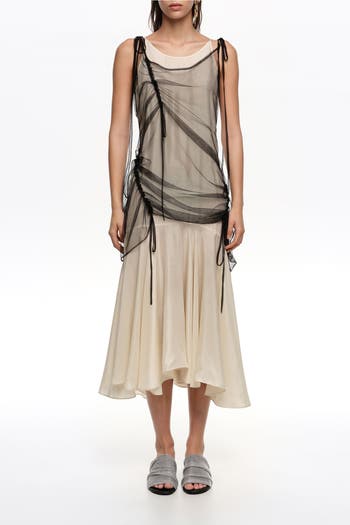Midi dress with an A-line flared cut. Features a rounded neckline with long maxi bow straps and a ruched mesh overlay.