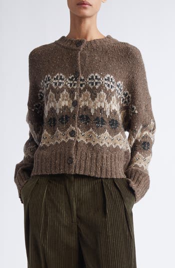A modern interpretation of a traditional Fair Isle motif patterns this cardigan knit from a tweedy wool blend and framed with dropped shoulders.