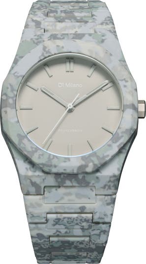 A camo-patterned design and clean, matte dial add modern minimalism to a quartz-powered watch shaped from lightweight polycarbonate.