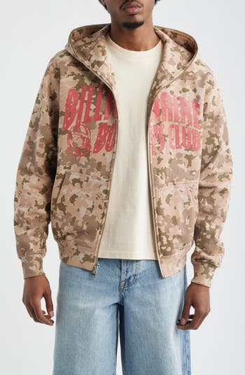An extended front zipper and a relaxed fit make this cotton hoodie perfect for layering, while a signature graphic pops on the bold camo background.