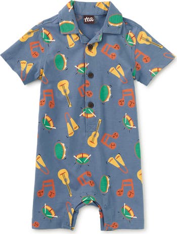 A stylish twist on a classic favorite! This short raglan sleeve romper features a samba-inspired print of Brazilian Bateria Instruments. Made from soft, breathable 100% cotton jersey, perfect for keeping your little one comfy and stylish. With a center front placket button closure and convenient inseam snaps, dressing and diaper changes are a breeze. Above-the-knee length.