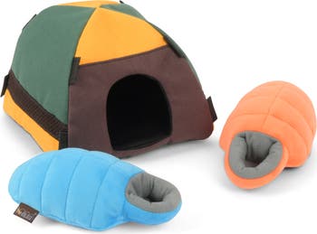 P.L.A.Y. CAMP CORBIN COLLECTION TRAILBLAZING TENT - Measures: 6.3"L x 6.3"W x 5.3"H. Inspired by our beloved office dog and head product tester, Corbin's love of the great outdoors, P.L.A.Y.'s Camp Corbin Dog Toy Collection has arrived! This collection is a tribute to Corbin's favorite camping essentials, reimagined in plush toy form for your furry friend's enjoyment. Step into the world of adventure with toys like the tent featuring cozy sleeping bags inside. Each toy is crafted with care and attention to detail to ensure maximum fun and durability. Join us in honoring Corbin's legacy and creating unforgettable memories at Camp Corbin, where playtime truly never ends. And for those looking to embrace the full Corbin experience, why not use one of these camping dog toys as a pillow and sleep under the stars, Corbin-style? Let the adventure begin! STRICT QUALITY STANDARDS: All of our toys meet the same strict quality standards for manufacturing infant and children products. Meet requirements for EN71 – Part 1, 2, 3 & 9 (EU), ASTM F963 (US) toy safety standards and REACH - SVHC.