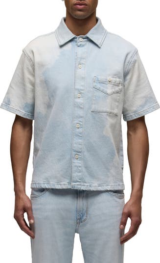 Stretch-hinted denim with a bleached wash lends rugged, utilitarian appeal to this short-sleeve button-up finished with signature V-shaped back seams for a tailored touch.