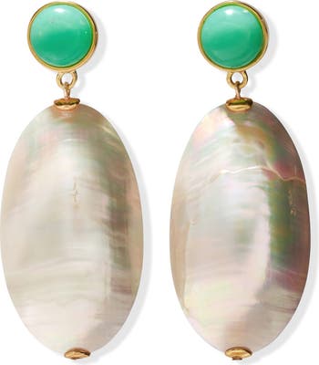 These statement-ready earrings bring bodacious style to both day and evening looks with their amazonite studs being anchored by glowing shell drops.