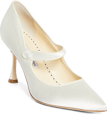 Complete your vintage-inspired bridal look with this pointy-toe pump crafted in Italy from ivory-hued satin with a mary jane strap and pedestal heel.
