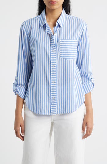 Stripes switch directions to add extra style points to an endlessly wearable button-up cut from a cool cotton blend.