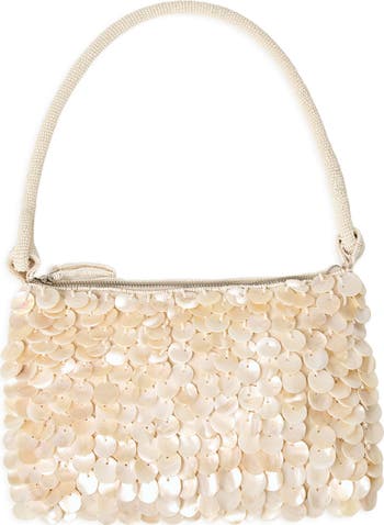 Elevate your day-to-night look with this playful handbag adorned in glassy embellishments and milky beads.