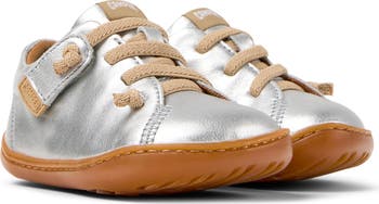 Soft leather adds flexible-yet-sturdy style to a play-ready sneaker built to mimic the feeling of moving about barefoot. Knotted stretch laces make it easy to slip on and off, and mixed treads deliver excellent traction for wobbly walkers.