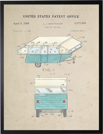 This vintage-inspired print, framed in a black wooden frame, features a camping trailer patent. Sized at 16 inches by 20 inches, this made in the USA frame makes for a beautiful addition to any wall.