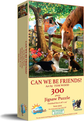 "Can We Be Friends?", a 300-piece jigsaw puzzle for adults, takes you on a heartening adventure of exploring the charm of unexpected friendships within a whimsical, nature-inspired illustration by Tom Wood. SunsOut—proudly woman-owned—manufactures this 18" x 24" puzzle from high-quality recycled cardboard, featuring a worry-free guarantee for any issues with missing or damaged pieces, all possible due to the strict manufacturing standards upheld in the USA. This shows their commitment to superior quality and excellent customer service. SunsOut also utilizes soy-based inks and premium recycled board for the creation of their puzzles, this eco-friendly approach ensures sustainable practices while delivering vibrant, long-lasting artwork. Packaged in large, full-color display boxes, the "Can We Be Friends?" puzzle is a stunning piece of art to be admired while assembling it and upon completion. Each piece reveals elements of humor and heart, inspiring joy and connection, thus capturing the essence of springtime and the playful spirit of friendship amongst various animals. With this puzzle, you can delve into the captivating world of nature, animals, and explore Tom Wood's fully licensed artwork whilst bridging the gap between bonding, relaxation, and sparking the imagination. Whether shared with others or enjoyed solo, the puzzle promises hours of entertainment and contemplation as you unlock the magic of bringing a picture to life, piece by piece, ultimately savoring the satisfaction of crafting a serene interconnected world on your tabletop.