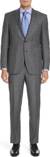 Charming plaid defines a handsome Italian suit crafted from pure wool and framed with crisp notched lapels.