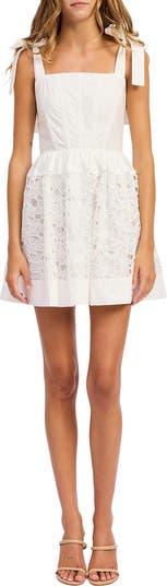 A minidress that maximizes on detailing features a corset-style bodice topped with tie straps and finished with a short peplum that overlays the top of the guipure-lace skirt.