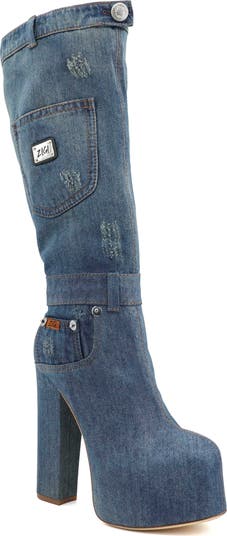 A towering wrapped heel and platform bring attention-seeking detail to a knee-high boot crafted from distressed denim inspired by your favorite pair of jeans.