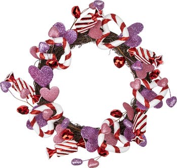 Pink, purple, red and white hearts and candies combine in the playful 16” valentine wreath. Red and white hard candies and candy cane striped hearts are arranged on a twig wreath frame, along with glittery purple and pink heart cut-outs. Shimmery pink hearts and shiny red crystal heart beads add extra shine to a Valentine wreath that can’t help but add a light-hearted atmosphere to your Valentine’s Day decor. Product Features: Striped artificial candies Purple and pink hearts and ornaments Sturdy twig backing for hanging Recommended for indoor use only - if using outdoors place under a covered area No assembly required - wreath comes in 1 piece Dimensions: 16" diameter (measured from outermost edge to outermost edge across the wreath) Material(s): plastic/felt/foam