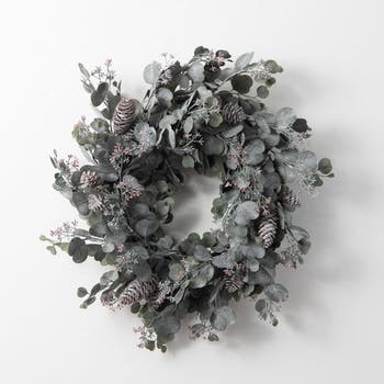 Expertly crafted to mimic natural eucalyptus leaves and pinecones, this wreath adds a sophisticated, seasonal touch to your front door.